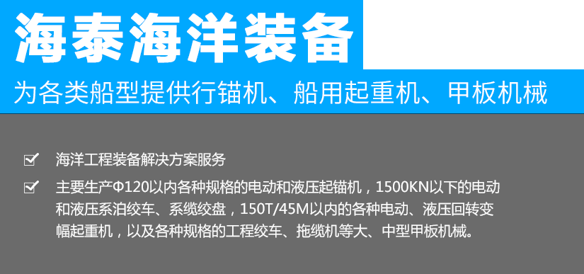 常規航行錨機、系泊絞車、系纜絞 電動(或液壓)起錨機、起錨絞盤 電動(或液壓)系泊絞車 電動(或液壓)系纜絞盤 YQ型電動液壓起重機 港口拖輪、三用工作船用設備 艏部航行錨兼拖帶絞車